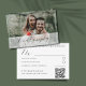 Apresentamos nosso elegante cartão de resposta RSVP, projetado com um toque personalizado para tornar seu planejamento de casamento perfeito. Essa placa sofisticada apresenta sua foto personalizada, adicionando um elemento pessoal e sincero. Os sotaques verdes fornecem um toque de elegância natural, complementando perfeitamente o simples e na moda. Incluído é um conveniente código QR que se liga diretamente aos detalhes do casamento, fazer fácil para seus convidados responderem e acessarem informações importantes. Esta placa RSVP combina a praticidade com beleza, garantindo que seus hóspedes possam compartilhar facilmente em seu dia especial.