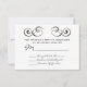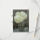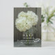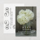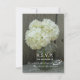 Um rsvp de casamento com uma foto de um pote de hidrangeas brancas sobre um pano de fundo de madeira em frente. Texto branco. O lado oposto apresenta texto escuro de cinza. Procure convites na Paperie de Jill.