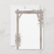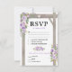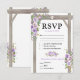Cartões de resposta de casamento elegantes com um fundo branco chique que pode ser alterado para qualquer cor, uma exibição floral em aquarela roxa e lavanda em um arco de madeira rústica, um coração esculpido com as iniciais do casal e um modelo simples de RSVP de casamento com opção de menu.