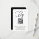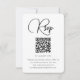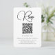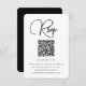 Este moderno cartão de resposta do casamento apresenta um lugar para o seu código QR para que os convidados possam facilmente consultar o seu site de casamento. A frente apresenta um design preto e branco simples e limpo com a tipografia do roteiro de letras. A parte de trás mínima é preto sólido.