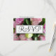 RSVP de Casamento escrito em elegante script preto dentro geométrico branco e retângulo prateado. Rosas cor-de-rosa suave em fundo, Personalize o verso em cor dourada e tipografia preta em fundo branco nítido. Fotografia original e Design por TamiraZDesign.