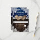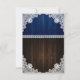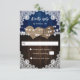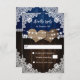 Cartões RSVP de casamento azul-rústicos, romenos, com marinho azul, apresentando dois corações em uma lenha e um fundo de renda enfeitados com luzes de cordas. Itens correspondentes disponíveis.