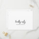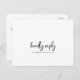 Este cartão postal RSVP, de escolha do cardápio, é perfeito para um casamento no campo. O simples e moderno design preto e branco apresenta uma alusão à caligrafia manuscrita caprichosa única, com um estilo de boho minimalista contemporâneo. Personalizável em qualquer cor. Mantenha o design mínimo e simplista, como está, ou personalize-o adicionando seus próprios gráficos e trabalhos de arte. Este cartão postal de resposta do casamento pergunta aos convidados qual refeição eles gostariam na sua recepção.