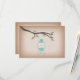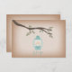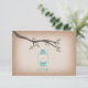 Uma r.s.v.p. de casamento ao ar livre com uma ilustração de uma lanterna azul-clara pendurada em um galho de árvore com folhas verdes. O plano de fundo é o estoque de cartões inspirado.