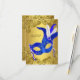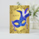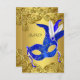 Bela máscara de pena azul real e mascarada de ouro RSVP. Este RSVP de partido ouro e mascarada azul é facilmente personalizado para o seu evento adicionando os seus detalhes no estilo de letra e na redação da sua escolha.