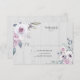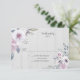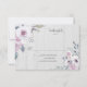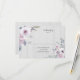 Flores rústicas em tons mudos de violeta, lavanda e roxo com sotaques florais brancos e verduras alinhadas em um RSVP de fundo de madeira reluzido. Convidado de casamento.