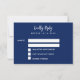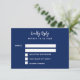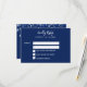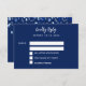 Um fundo azul marinho. Na frente: Personalize e adicione a resposta por data. Voltar: adicione um nome, evento e data do evento. Decorado com confete azul.