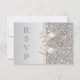 Cartões de RSVP elegantes e personalizados em prata e champanhe claro com um belo padrão de lantejoulas prateadas impressas, um laço lilás brilhante impresso e fita e uma bonita joia de diamante brilhante impressa. Esses cartões planos sofisticados, glamorosos e fashion são decorados em ambos os lados. Convites lindos, chiques, modernos e atuais. POR FAVOR, NOTE QUE: São gráficos impressos planos - sem laços, lantejoulas ou partes em relevo. O texto, a fonte e a cor da fonte podem ser personalizados. Se precisar de ajuda para personalizar seu produto, entre em contato comigo através da minha loja. Ficarei feliz em ajudar. Tenho produtos correspondentes na minha loja.