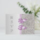 Cartões de RSVP elegantes personalizados em prata e lilás com um lindo padrão de lantejoulas pratiadas, um laço lilás brilhante impresso e fita e uma bonita joia de diamante brilhante impressa. Esses cartões planos sofisticados, glamorosos e fashion são decorados em ambos os lados. Convites lindos, chiques, modernos e atuais. POR FAVOR, NOTE: São gráficos impressos planos - sem laços, lantejoulas ou partes em relevo. O texto, a fonte e a cor da fonte podem ser personalizados. Se precisar de ajuda para personalizar o seu produto, entre em contato comigo através da minha loja. Estou à disposição para ajudar. Tenho produtos correspondentes na minha loja.