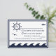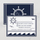 Convites de casamento RSVP, azuis e brancos, marinho náuticos - o design da frente é composto por uma roda, gaivotas, corda e ondas do oceano de fundo. Os designs, o texto e os contornos em azul marinho com um fundo branco. Na parte de trás está uma roda maior de um navio com ondas no fundo, e corda, que são brancos sobre um fundo azul marinho. Por padrão, o papel é definido como estoque básico de convites, mas pode ser alterado clicando em 'escolher seu estilo' e usando a caixa suspensa Papel, selecione uma das opções. Para alterar a fonte, o tamanho da fonte ou a cor da fonte, clique no botão personalizar abaixo do convite de casamento náutico. Observe que você pode ter que personalizá-lo se determinadas palavras forem muito longas e, portanto, ele ajustado melhor. Se estiver satisfeito com a configuração da fonte, você poderá usar o recurso personalizar para alterar as informações da demonstração para seus detalhes pessoais. Clicando nas pequenas imagens da frente/traseira da placa com mudança para aquele lado para que ela possa ser alterada. Quando terminar, verifique se as informações aplicadas estão corretas e se você não tem erros ortográficos em ambos os lados da placa. Outros produtos que acompanham este.