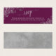 Este cartão miniatura é perfeito para adicionar um endereço online do Rsvp aos seus convites para o casamento. Possui um elegante design de cassis roxo ou magenta com caramujos e espirais e caligrafia de cinza prateada com leitura de RSVP. Há espaço para o URL do seu site e um prazo de resposta. O dorso é uma linda cinza marmoreada.