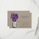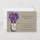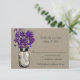 Cartão de RSVP perfeito para um casamento em estilo country ou talvez você simplesmente adore Mason Jars! Pote de Mason pendurado em um gancho cheio de flores silvestres country. Desenho preto de um Pote de Mason cheio de flores silvestres country roxas Berinjela Madura (02:6:2:7) contra um fundo de aniagem bege. Se tiver alguma dúvida sobre este design ou quiser uma mudança de cor, por favor me envie um email paula@labellarue.com. Verifique também os cartões de RSVP, RECEPÇÃO e ASSENTOS DE CONVIDADOS para combinar!