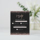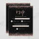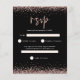Um valor para o alternativo do ORÇAMENTO em tamanho menor de 4,5 x 5,6" de semirbrilho de 110 lbs, que é de espessura semelhante a um cartão postal (no entanto, não é adequado para uso como cartão postal). POR FAVOR, NOTE que existe UM por folha. RSVP Preto do Script Glitter Dourado rosa. Rosa dourado borda o topo e o fundo em cada lado e uma tipografia elegante para o título RSVP e o resto do texto que você pode personalizar facilmente.