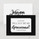 Todo noivo precisa de seus melhores amigos ao seu lado no dia do seu casamento. Peço-lhe, pois, que se levante em seu favor com este cartão de padrinho de casamento. Possui um simples design preto e branco que é formal em termos de redação, mas usa um tipo branco ousado, para torná-lo apropriado para qualquer situação. Inclui um espaço para inserir uma mensagem especial.