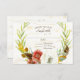 Cartão de resposta RSVP com nome(s) de convidado e respostas para uma contagem exata de cabeçalhos para sua restauração. Mão pintada em aquarela para um toque rico, elegante e moderno. O pano de fundo é de latido de pássaros suavemente pintados com uma coroa de eucalipto, acordeada de uma papoila vermelha profunda, flor branca de anôneo, penas e folhas cortadas dispostas em um BOHO moderno, coroa boêmica. Copyright, Audrey Jeanne Roberts, todos os direitos reservados.