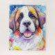 Uma imagem de arte digital de um cão Bernard Santo. O uso de cores vívidas e detalhes intrincados dá vida ao caráter lúdico do cão.