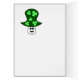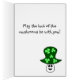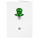 Um cogumelo cartoon com uma tampa verde em forma de chapéu de duende. O boné tem manchas de shamrock. O caule branco tem um rosto feliz, porque todos os fungos adoram celebrações. O fundo é verde-claro com um padrão de shamrock branco. Na frente do cartão lê-se "Feliz Rua. Dia de Patrick" e o dentro diz "Que a sorte dos cogumelos esteja com você!"