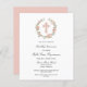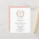 Um elegante design da Primeira Comunhão apresenta uma cruz rosa em uma coroa floral no topo do convite. O texto é uma combinação de fontes tradicionais itálicas e verticais.