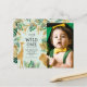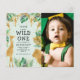 Convide convidados para comemorar o primeiro aniversário do seu filho com este convite temático safari da selva, que inclui uma coleção de folhagem e animais da selva de folha verde e dourada (girafa, leão, macaco) em torno das palavras "Selvagem Um" em tipografia desenhada à mão sobre um fundo verde-claro. Substitua facilmente a imagem por sua foto favorita do aniversariante ou garota. A parte de trás da carta apresenta um padrão de folhagem verde e dourado da selva.