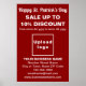 Poster vermelho para Ruas. Dia de Patrick que você pode personalizar especificando a porcentagem de desconto, datas de venda, fazendo upload do logotipo de sua empresa, digitando seu nome de empresa, endereço, número de telefone, e-mail e site. Personalize-o e exiba-o para atrair mais clientes para comprar de seus produtos ou clientes para gostar de seus serviços. Verifique a aparência após carregar o logotipo e digitar textos. Se a aparência lhe agrada, você pode colocar seu pedido agora. Se precisar redimensionar e reposicionar o logotipo e as mensagens em ajustado neste poster ou no tamanho e estilo que você escolheu, ajuste na ferramenta design. Você também pode alterar a cor do plano de fundo, a cor da fonte e o estilo da fonte na ferramenta design. Feliz Rua, Dia de Patrick! Desejando-lhe o melhor de sorte, alegria e mais vendas neste feriado.
