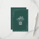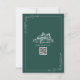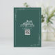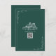 RSVP de Casamento com ilustração de celeiro rústico com fronteira botânica. O fundo é esmeralda. Personalize o texto e o código QR.