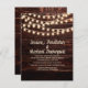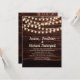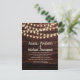 Convite de casamento com uma madeira de fundo castanho-escuro rústica e luzes de cordas cintilantes