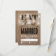 Estes cartões rsvp de casamento de campo brancos vêm como um conjunto de casamento correspondente com um fundo de efeito burlap castanho rústico, luzes giratórias de jarro elegantes, as palavras "EAT, DRINK AND BE CASADO" e os detalhes de sua resposta de casamento.