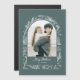 This unique design features a trendy arch-shaped photo template with a white line drawn winter botanical border on a sage green background.