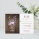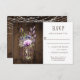 RSVPs russos apresentando um jarro de mason repleto de flores silvestres violetas, roxas e lavandas com o hálito e o verde do bebê e adornada com uma fita roxa. A parte traseira da placa apresenta luzes brancas de cordas com um jarro de pedreiro violeta pálido sobre um fundo de madeira de celeiro de agentes atmosféricos. Se você quiser essa design em um produto correspondente, ou precisar de ajuda, entre em contato comigo através da minha loja.