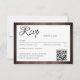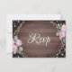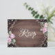 Rustic wedding RSVP card featuring a rich wood background, soft floral accents, and delicate string lights framed by modern geometric lines. Elegant script typography adds a romantic touch, blending rustic charm with contemporary style. Perfect for barn weddings, outdoor celebrations, or nature-inspired wedding stationery suites.