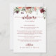 Esta carta de boas-vindas florais de verão é perfeita para um casamento moderno. A design apresenta flores de aquarela, cor-de-rosa e borbulhante, com folhas verdes em fundo castanho manchado. Personalize a frente com uma mensagem de boas-vindas para seus convidados e seus nomes. Personalize as costas com a programação de eventos e outras informações úteis.