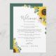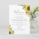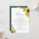 Esta carta de boas-vindas e cartões itinerários são perfeitos para um casamento no campo. O design floral boêmico apresenta girassóis amarelos, flores cor-de-rosa pinceladas e verde-caçador de eucalipto verde em aquarela com um elegante e moderno sentimento de bolho. A frente da carta apresenta uma carta de boas-vindas e a parte de trás da carta apresenta o itinerário do casamento. Estas notas são perfeitas para casamentos de destino e bolsas de boas-vindas de hóspedes.