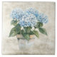 Rustic watercolor blue blooming hydrangeas in a potted plant on a beautiful background for your country French or cottage farmhouse kitchen. Simply stunning. Faux texture background.