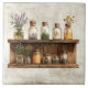 Rustic watercolor graphic design of watercolor herbs and wildflowers in jars on a wooden shelf. Perfect for your country French or cottage farmhouse kitchen. Faux texture background.