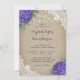 Convites de casamento de hydrangea roxa russa inspirados por flores de hydrangea roxas em uma burlap rustica e fundo de renda.