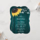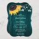 Este convite floral de casamento com um girassol contra um fundo de madeira de celeiro adornado com luzes de cordas é perfeito para convidar seus convidados para sua festa de casamento rústica teal inspirada em girassóis. Fácil de personalizar a modelo. Design totalmente personalizável.