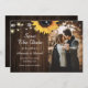 Girassol russo salva os cartões com fotos de data que apresentam girassol contra um fundo de madeira de celeiro adornado com luzes de cordas.