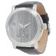 Um relógio com uma cinza de prata, madeira rusticada, de fundo, personalizada com suas iniciais, faz um presente de excelente para qualquer homem. Quando você personaliza as iniciais, deixe um espaço entre as iniciais para obter o efeito que você vê no exemplo.