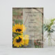 Personalize o menu informal, porém elegante, Rustic Sunflower e Wagon Wheel Country Wedding, com os detalhes da refeição que você servirá no seu chá de panela do rancho ocidental, janto de recepção de casamento ou posto de brunch de casamento. Personalize-o com os nomes da noiva e noiva, local e data. Este charmoso menu nupcial floral personalizado apresenta uma fotografia floral fino e pintada digitalmente de flores de girassol amarelas e uma velha roda de vagão enferrujada.