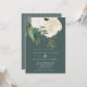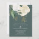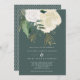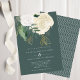 Um convite de casamento moderno e romântico, perfeito para um outono ou casamento no inverno. Esta design apresenta uma cascata de rosas de aquarelas em branco e marfim, folhas verdes e uma poeira de brilho sujo, sobre fundo verde-escuro. O reverso também está em verde escuro sólido.
