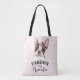 Esta bolsa de tote divertida tem um cachorrinho branco e castanho-claro, Bulldog Francês com um pequeno buquê de flores roxas, cor de pêssego, verdes e aquarelas e folhas sentadas em sua testa. O texto personalizável diz "Perdoe meu francês".