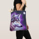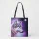 Esta é uma bela sacola de tote para um amante de lobo que apresenta uma ilustração de um perfil místico da face do lobo em branco e tons de roxo e azul.