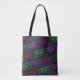 Um saco de tote colorido, com um padrão de cassete multicolorido neon. Inclui cassetes de áudio com cores rosa, vermelha, azul e verde no fundo preto