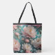 Esta bolsa tote de ombro é mostrada com uma encantadora estampa multi floral de peônias em tons de rosa pêssego e turquesa celeste.
