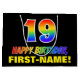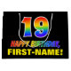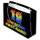 Este design de bolsa de presente animado, divertido e colorido com tema de aniversário apresenta um grande número de "19" e a mensagem "FELIZ ANIVERSÁRIO", ambos tendo um gradiente de espectro do arco-íris inspirado na coloração de padrões, juntamente com um nome de destinatário personalizável amarelo ousado. O fundo é preto colorido. Uma bolsa de presente divertida como esta pode ser usada ao embrulhar presentes que são dados a alguém em comemoração do seu 19.º aniversário. [~Z0000477]