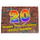 Este design de bolsa de presente temático de aniversário divertida e vibrante, inspirado no grafite e na arte urbana, apresenta um grande número de "20" tendo um padrão inspirado no espectro do arco-íris. Ele também apresenta a mensagem "Feliz 20 Aniversário", e um nome personalizado. O plano de fundo apresenta um padrão de estilo de parede de tijolos. Uma bolsa de presente colorida para temas de aniversário como esta pode ser uma maneira divertida de embrulhar um presente ou de apresentar a alguém que comemora seu vigésimo aniversário. [~Z0000522]
