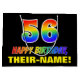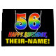 Este design de presente de aniversário alegre, divertido e colorido apresenta um grande número "56" e a mensagem "FELIZ ANIVERSÁRIO", ambos tendo um gradiente de espetáculo arco-íris inspirado na coloração de padrões, junto com um nome ousado de destinatário personalizado amarelo. O fundo é preto colorido. Uma bolsa de presente divertida como esta pode ser usada ao embrulhar presentes que são dados a alguém em comemoração de seu 56º aniversário. [~Z0000477]
