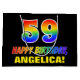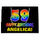 Esta design de bolsa de presente divertida, colorida e animada, com tema de aniversário, apresenta um grande número de "59" e a mensagem "FELIZ BIRTHDAY", ambos tendo um gradiente de padrão inspirado no espectro do arco-íris, juntamente com um nome ousado de destinatário personalizável amarelo. O fundo é preto colorido. Uma bolsa de presente de aniversário divertida como esta pode ser usada quando se dá um presente ou presente em comemoração do cinquenta nono aniversário de alguém. [~Z0000477]