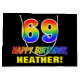 Este design de presente de aniversário alegre, colorido e divertido apresenta um grande número de "69" e a mensagem "FELIZ ANIVERSÁRIO", ambos coloridos com um padrão inspirado no gradiente do espectro do arco-íris, juntamente com um nome ousado de destinatário personalizável amarelo. O fundo é preto colorido. Uma bolsa de presente de aniversário divertida como esta poderia ser usada para embrulhar um presente ou presente para celebrar o 69º aniversário de alguém. [~Z0000477]