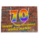 Este design de presente de aniversário divertido e colorido, inspirado pelo grafite, apresenta um grande número de "70" tendo um padrão inspirado no gradiente do espectro arco-íris. Ele também apresenta a mensagem "Feliz 70 Aniversário", e um nome personalizável. O plano de fundo apresenta um padrão inspirado na parede do tijolo. Uma bolsa de presente temida de aniversário vibrante como esta pode ser usada quando se dá um presente ou presente em comemoração do 70 de alguém. [~Z0000522]